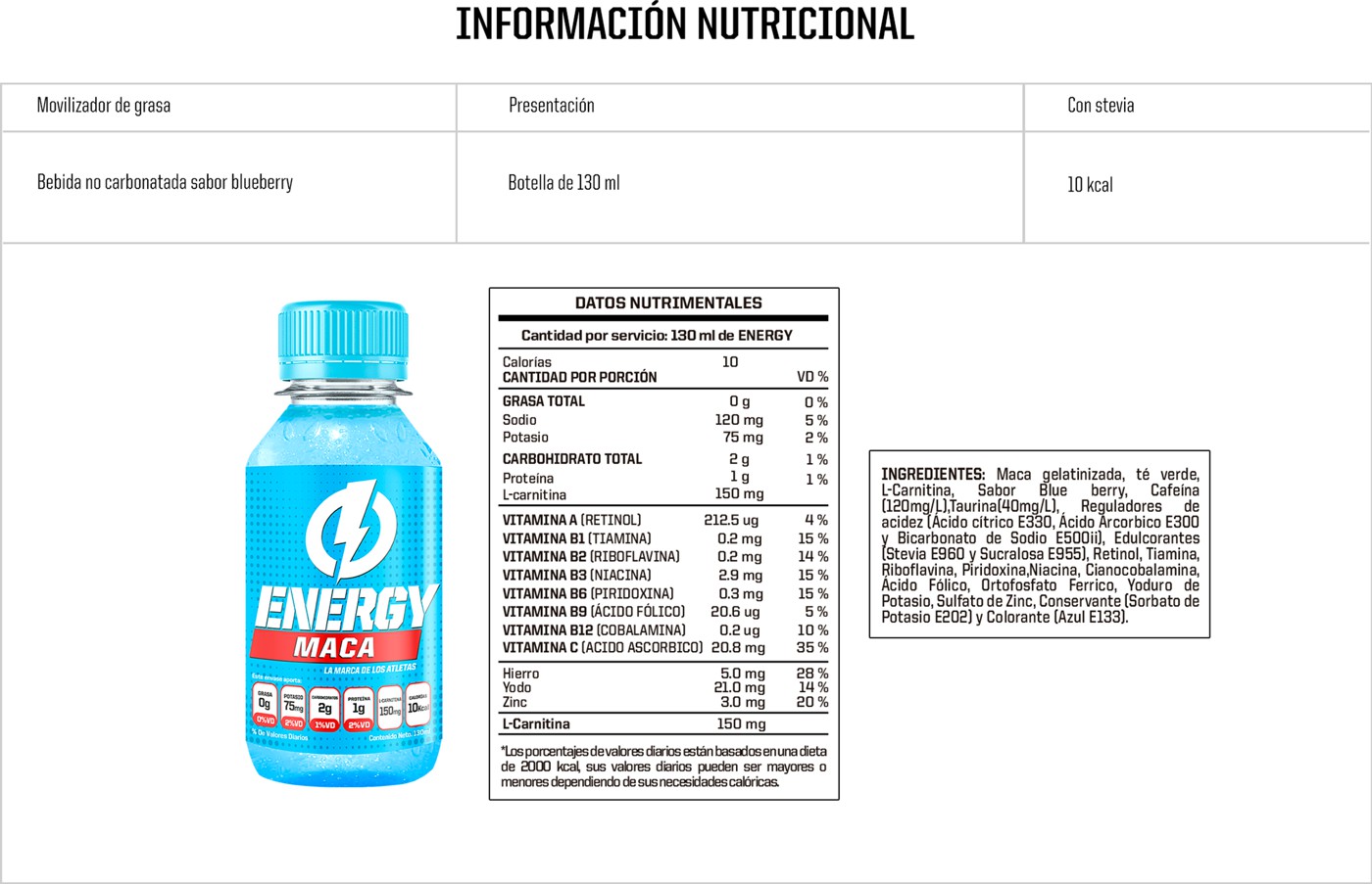 Consumir 1 vez al día una botella de Energy maca 15 a 20 min. antes de realizar actividad física.